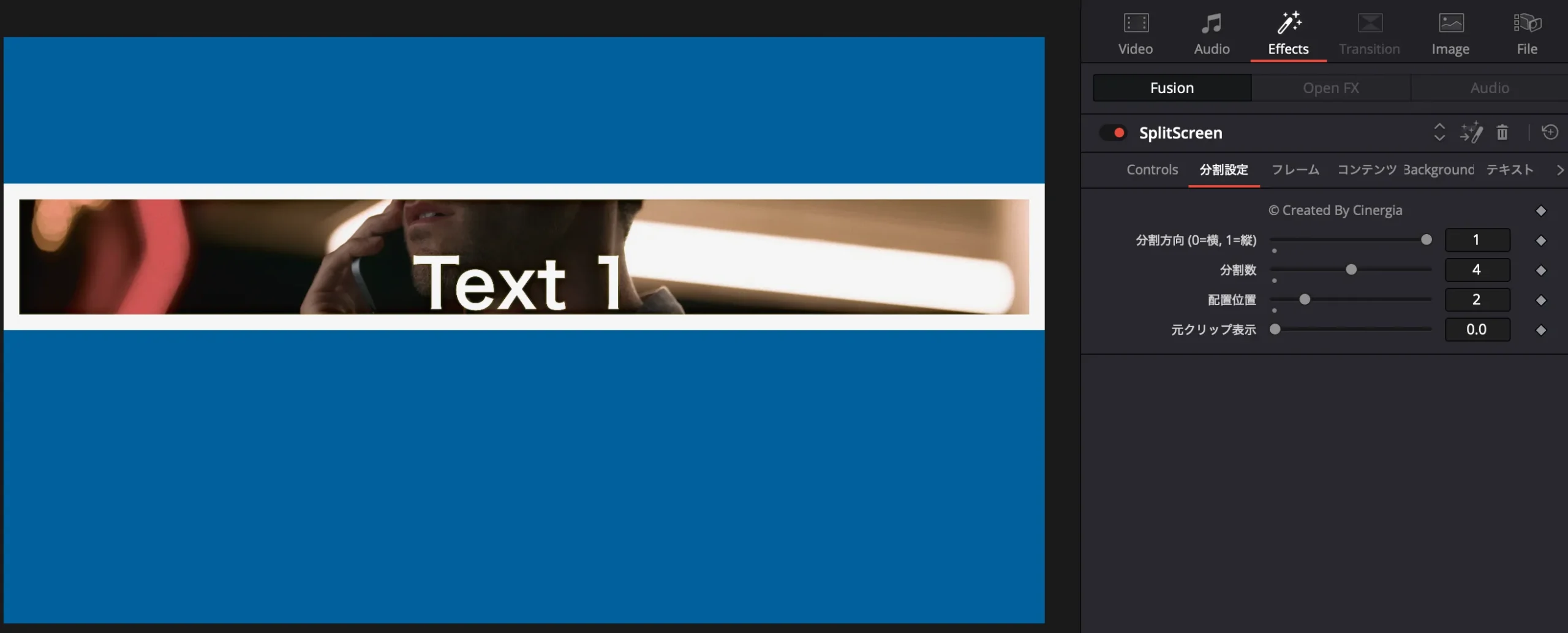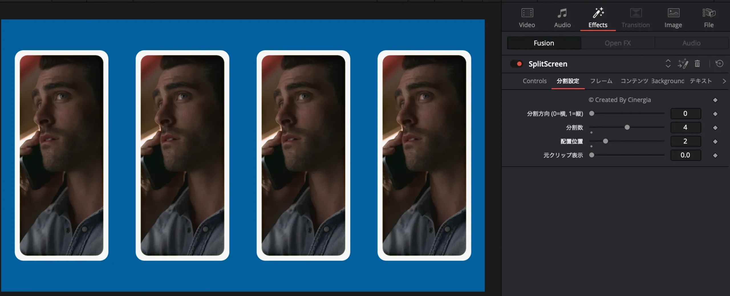 DaVinci Resolveのエディットページにて使える「画面を分割する」プラグインを開発しました。指定した数で縦や横に分割したり、フレームを追加したり消したり、フレーム内のみの映像素材を移動させたり、背景に色を敷いたり、これ一つで分割に関する煩わしいことは完結するように設計しております。ワイプにして見せたり、比較して見せたり工夫してみてください。